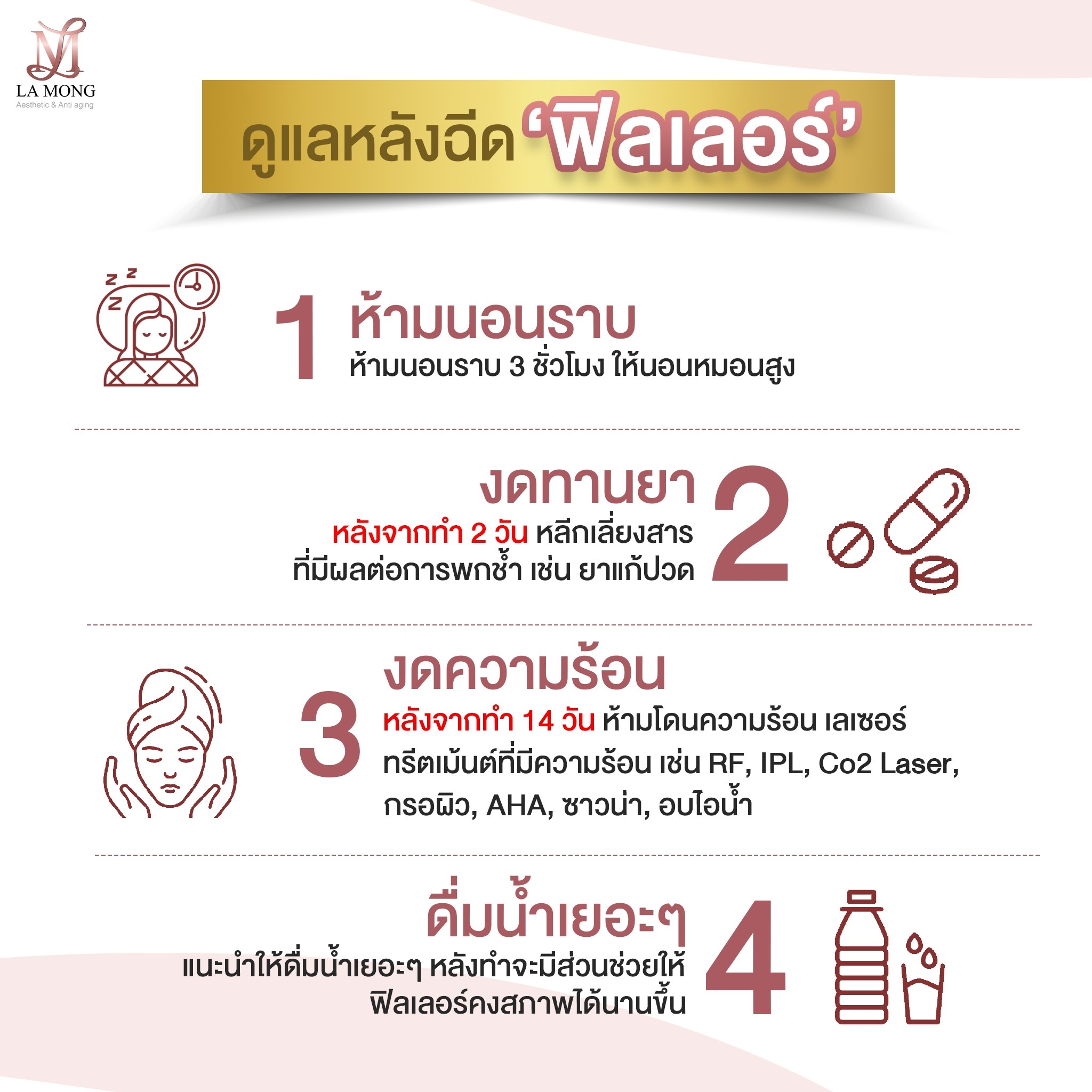 - ภายใน 2 อาทิตย์ ห้ามโดนความร้อน หรือ ทำเลเซอร์ รวมถึงทรีทเม้นต์ ที่มีความร้อน เช่น RF ยกกระชับ ทำ IPL ทำ Fractional Laser Co2 กรอผิว ทำ AHA ลอกหน้า รวมถึงการใช้ไดร์เป่าผม เข้าซาวน่า อบไอน้ำ เพราะความร้อนจะทำให้ฟิลเลอร์สลายเร็วขึ้น