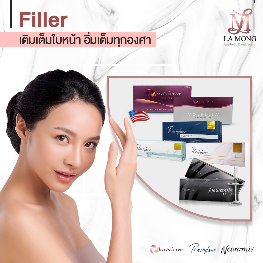 - Juvederm นำเข้าจากอเมริกา : มีเทคโนโลยี hylacross และ vycross ที่ทำให้เนื้อฟิลเลอร์มีความยืดหยุ่นสูง ทนต่อการขยับ สามารถยกกระชับได้ดี ฉีดแล้วจึงได้วอลลุ่มสวย ไม่เป็นก้อน ไม่เป็นคลื่น สามารถเติมบริเวณใต้ตา ปาก โหนกแก้ม ร่องแก้ม ขมับ และหน้าผาก ได้ดีทีเดียว อยู่ได้นานประมาณ 12-24 เดือน
