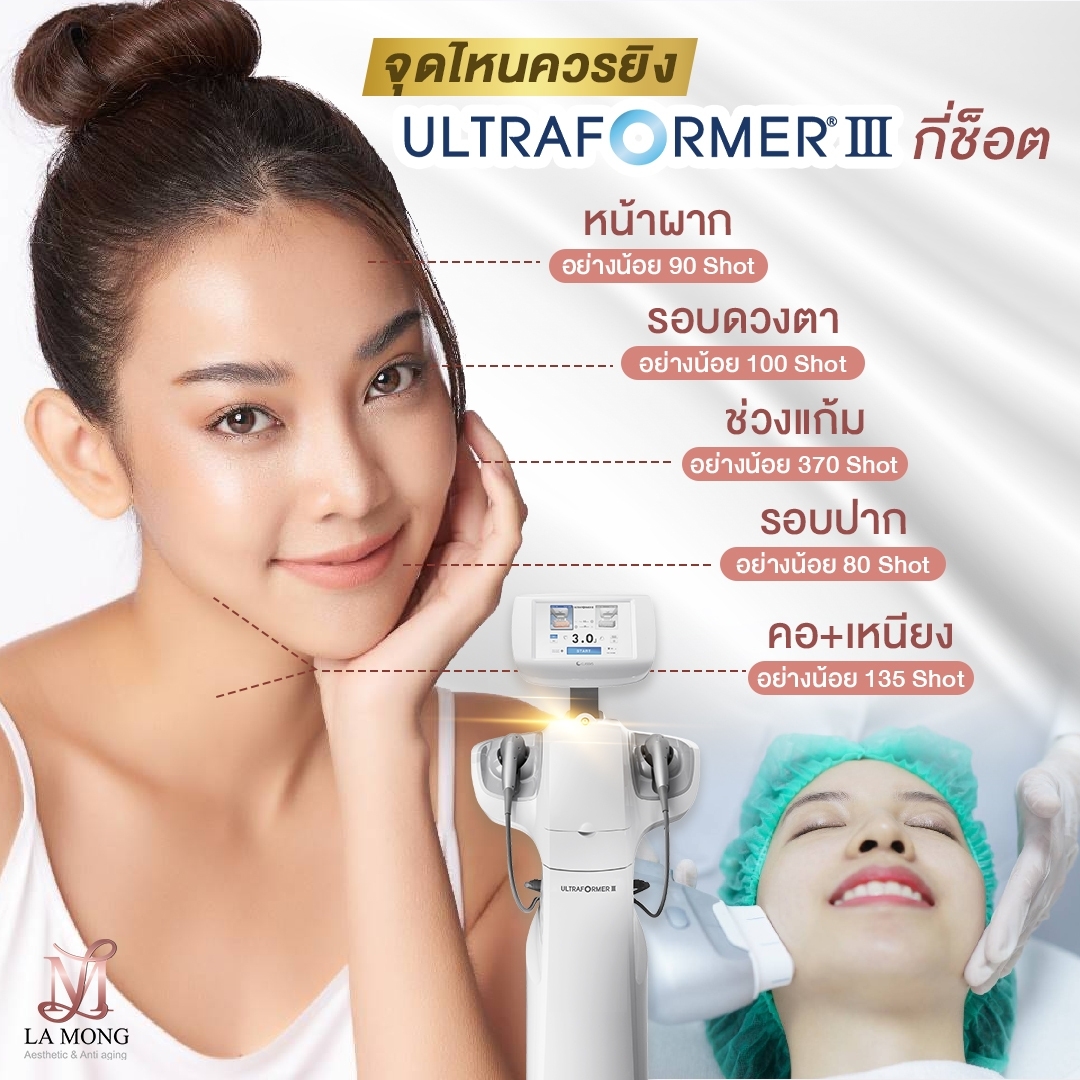 ที่คลินิกใช้เครื่อง ULTRAFORMER III แท้ มาตรฐาน ประสิทธิภาพสูง เป็นระบบ macrofocus รอบพลังงานไวที่สุดเมื่อเทียบกับยี่ห้ออื่นๆ สามารถใช้พลังงานได้สูงเต็มที่ และระหว่างยิงพลังงานจะคงที่ ผ่านการรับรองมาตรฐานจากยุโรป มีหัวยิงที่สามารถ ยิงสลายไขมันได้บางส่วน จึงสามารถยกกระชับผิวหย่อนคล้อยให้ตึงขึ้น ใช้เวลาในการรักษาประมาณ 15-30 นาที และไม่ทำให้เกิดบาดแผล หลังการทำสามารถแต่งหน้าได้ปกติโดยไม่ต้องพักฟื้น